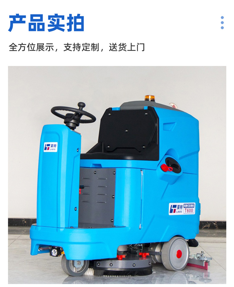 莱特工业洗地机T600型,机身尺寸:1370*800*1300mm,吸水扒宽度:1000mm,额定电压:DC24V,工作效率:3600m²/h,标配电池容量:100A,连续工作时间:3-4h,工作宽度:530mm,刷盘转速:150rpm,刷盘功率:550W,吸水功率:600W,行走功率:1000W,行走速度:0-7km/h,清水箱容量:90L,污水箱容量:100L,声级:60dB(A),整车重量:201kg。具备:全自动升高和降低刷盘、吸水扒;倒车自带吸水趴和刷盘升降功能;污水箱满了自动停机功能;配有水量显示器,可直观观察水位变化;电磁刹车装置,坡道上停车时不会溜车,更安全;采用双控制器系统控制整车电控,维修简单快捷;浮球滤网+传感器双重保护设计可防止污水进入真空电机;更轻便小巧,适用于较小的场所,可直接进出电梯,方便清洗不同楼层;两个注水口设计:大注水口可实现快速注水,小注水口适用于远距离注水;污水箱易清洗。静音设计,适用于对声音敏感的环境,如办公场所,医院;吸水扒易装卸,遇到障碍物时自动脱落,可保护吸水扒,帮助机器顺利通过。